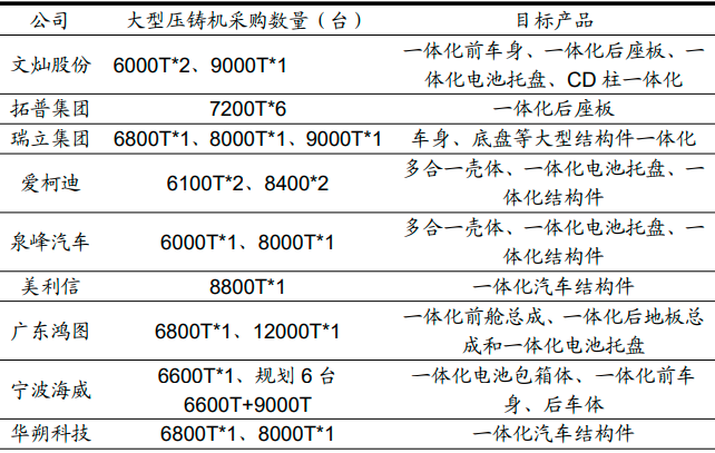 注:各铝压铸厂大吨位压铸机采购数量及规划产品
